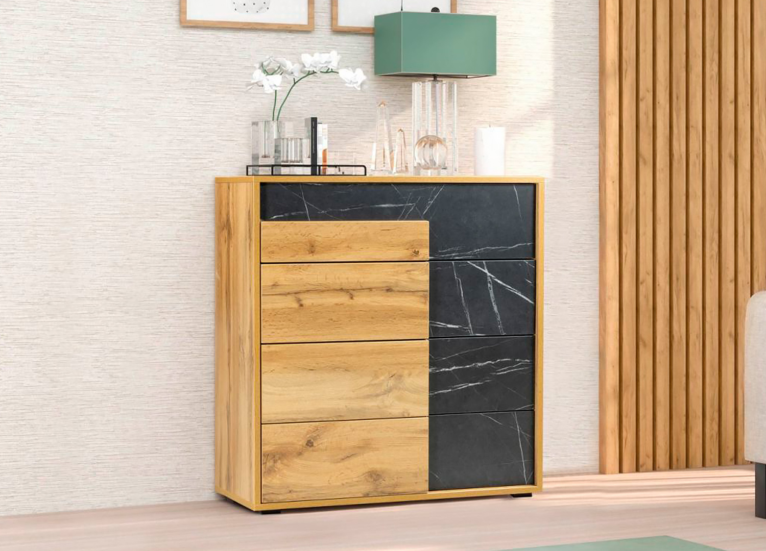 Используется ЛДСП 16 мм в современном цвете Дуб вотан и новинка Камень Пьетра черный – Egger.